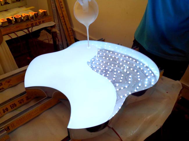 LED树脂发光字是由外壳、填充原料、发光源三部分组成。是由调制好的树脂倒入预先制好的模具里固化成型的,仅这个模具上,得考验产品的外观是不是美观和标准。并且模具成本方面不能太高以及制作方便快速。固化后脱模修整装灯了。